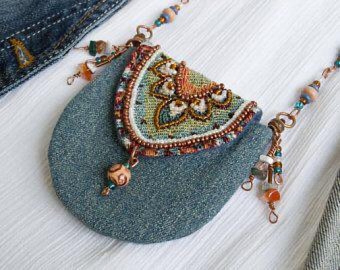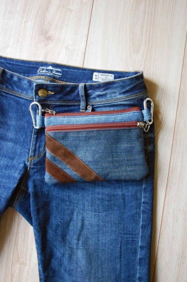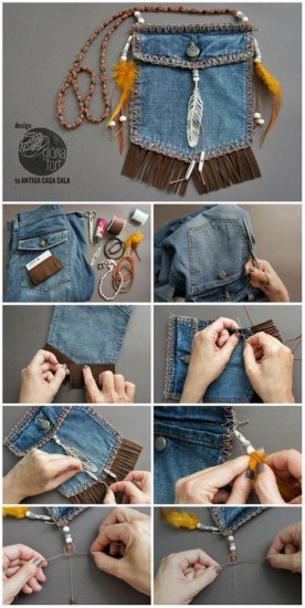 Making mini bags out of old jeans pockets Cut out the two pockets on your old jeans. If there are flap pockets, it will be more suitable for this model. Cut and sew a piece of velvet or suede fabric at the bottom of one piece and make it into a tassel. After sewing the two pocket pieces together, you can make a handle for your bag out of any leftover pieces and decorate the top of the bag with decorative pieces like beads or buttons.